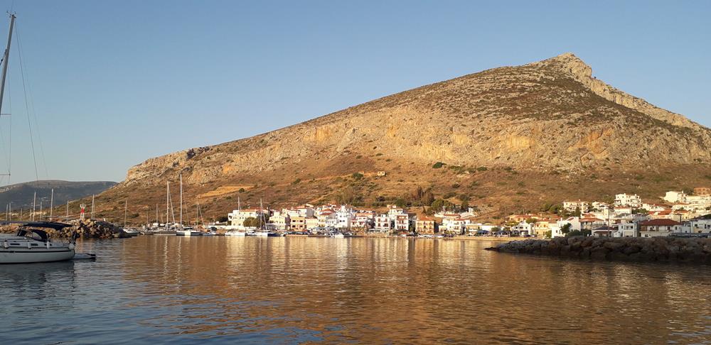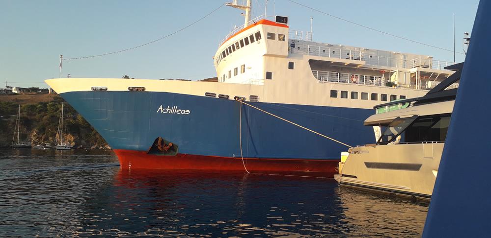 Aber ich finde mein Boot auch im Dunkeln wieder. Einen Tag später trifft auch die LUNA ein. Die drei anderen Boote wollen schon den nächsten Tag weiter nach Lesbos. Ich will eigentlich nach Moudros, auch um dort zu tanken. Aber der Wind lässt es nicht zu und so bleibe ich mit der LUNA noch ein paar Tage hier. Von meinem Ankerplatz habe ich einen guten Ausblick auf die großen Fähren, die hier ein paarmal am Tag hier an- und ablegen. Ist schon interessant zu beobachten, wie sie rückwärts anlegen und wie schnell sie ent- und beladen werden. Nach spätestens einer Stunde sind sie wieder weg.