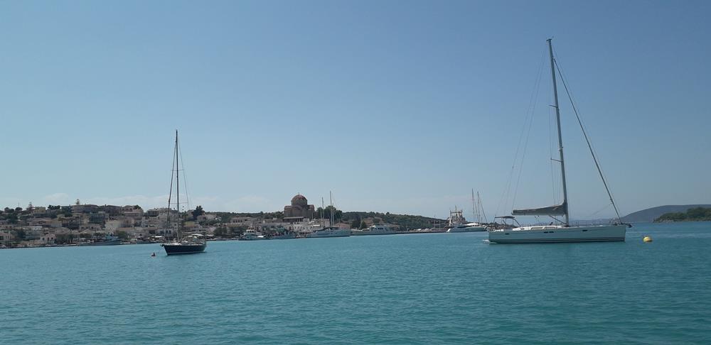 Die Häuser in den engen Gassen sind vielfach renoviert und nun Restaurant, Café, Andenkenladen oder Hotel. Alles nur für den Tourismus. Busse kommen angefahren und lassen ihre Gäste die Stadt erkunden. Die Stadt selber ist autofrei. Alles kann nur auf Karren angeliefert werden. Die Pumpe ist pünktlich eingetroffen und die Mechaniker kommen sehr gut vorbereitet am Nachmittag vorbei. Nach einer halben Stunde schon fertig. Kein Dieselaustritt mehr. Möge es lange so bleiben. Nach einer Woche kann es weitergehen, der starke Wind hat nachgelassen und ich kann lossegeln. Ziel ist eigentlich Spetses bzw. Porto Heli, aber der Wind lässt die Richtung nicht zu. Thomas und Erica sind auch los und wir beschließen in eine kleine Bucht auf der Festlandseite anzulaufen. Das Ankern ist bei mir auf diesem Boden schwierig, ich brauche mehrere Anläufe bis er fasst. Gleich früh morgens geht es weiter, nun rüber nach Porto Heli, die beiden anderen nehmen einen anderen Kurs Richtung Hydra. Die Bucht von Porto Heli ist sehr groß und bietet reichlich Ankerplätze. Hier fasst der Anker gleich beim ersten Mal.