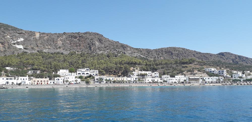 Im Hafen war kein Platz um längsseits zu gehen. So ankerte ich vor der Einfahrt und blieb hier den ganzen Tag. Am nächsten Morgen sehe ich, wie ein Schiff die Marina verlässt, dass gestern dort noch längsseits gelegen hatte. Sofort Anker auf und reingefahren. Tatsächlich, der Platz ist frei. Der Nachbar hilft beim Festmachen. Super. In der Stadt kaufe ich mir einen neuen Sonnenhut und nachmittags gehe ich zum Strand zum Baden und Duschen. Abends wieder bei Matteo gegessen. Noch einen Tag geblieben. Ich muss dringend den Wassermacher anwerfen und so fahre ich am nächsten Morgen um die Insel herum, dort liege ich ruhiger und das Wasser ist sauber. Um halb zwölf Anker auf und Segel gesetzt. Zunächst wieder schöne Fahrt, aber bereits nach einer Stunde nur noch schwacher Wind und ich komme nur noch mit 1-2 Kn voran. In die Bucht von Velanidia gefahren und dort in absoluter Ruhe und ganz allein im klaren Wasser geankert. Natürlich gleich gebadet.