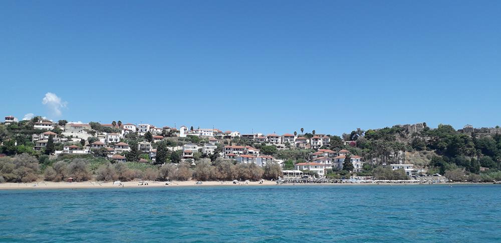 Thomas und Erica folgen am Nachmittag. Der Ort ist sehr touristisch, fast nur Apartments und kleine Hotels, der Strand schmal und stark besucht, aber in der Nacht nicht laut. Die Einkäufe sind schnell erledigt. Baden vor Anker in dem tollen Wasser ist einfach herrlich. Abends gehen wir in einer urigen Taverne lecker essen. Die LUNA segelt am nächsten Tag weiter, ich bleibe noch hier. Es gibt keinen Schwell, ich liege hier super. Nun kommen auch die KATMALU und die SURI hierher. Helmut holt mich ab zu einem Ankerbier and Bord der SURI. Im Laufe der Gespräche erzähle ich auch von meinen vielen Problemen dieses Jahr. Sofort bietet Helmut mir an, meine Wasserkanister mit seinem Wassermacher zu füllen. Er gibt mir auch einen guten Tipp, wie man sich hier zum Beispiel Ersatzteile herschicken lassen kann. Es gibt überall Stationen von Kurierdiensten, deren Adresse man als Lieferanschrift verwenden kann und die Sachen dort dann direkt abholen kann. Ich google und finde einen Shop in Nikiti. Im Internet bestelle ich den passenden Impeller bei einer griechischen Firma. Die sichern mir zu, die Ware dorthin zu schicken. Der Ort ist nicht weit weg und ich segele rüber. Die Marina nimmt am Wochenende keine Gastyachten auf, ich übernachte 1M entfernt in einer kleinen Bucht. Am nächsten Tag erhalte ich die Zusage für einen Platz und mache mich gleich auf den Weg. Eine Stunde später laufe ich ein. Am Steg bekomme ich auch Hilfe beim Anlegen. Einfache und schnelle Anmeldung. Es ist eigentlich ein Steg für Charteryachten, aber freie Plätze werden auch günstig (10 EUR/Tag) in der Woche vermietet. 2 Tage kann ich hierbleiben. Ich gehe einkaufen, die Supermärkte sind ein wenig außerhalb. Auf dem Rückweg erreicht mich ein Anruf der Firma, bei der ich den Impeller bestellt habe, dass dieser nun bereits zur Abholung bereitliegt. Wahnsinn, innerhalb von 24 Stunden. Zufälligerweise stehe ich in dem Moment gerade direkt gegenüber der Abholstation. Man händigt mir das Päckchen gleich aus. Das hat ja toll geklappt. Nikiti hat sehr viele Restaurants an der Strandpromenade und bei der Marina.