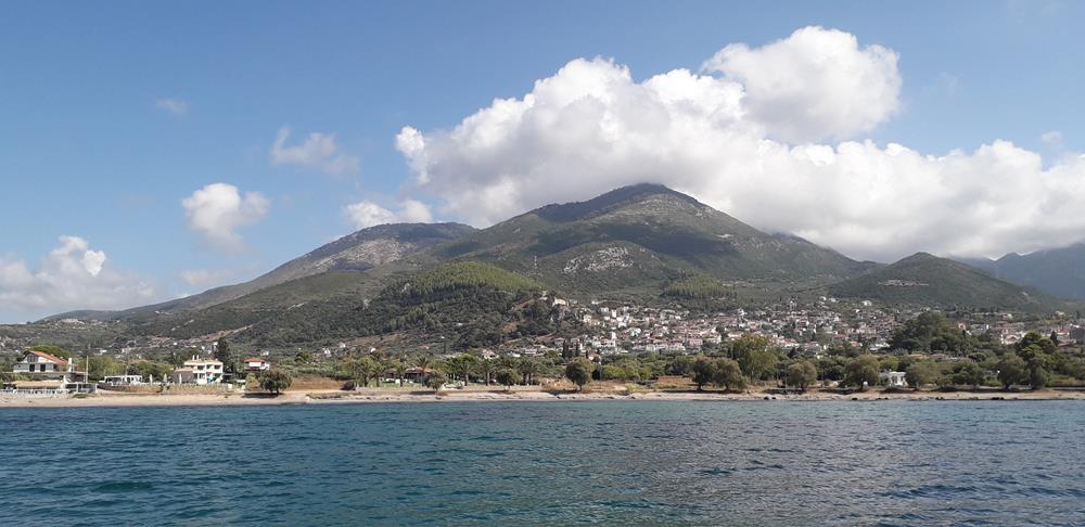 Heute geht es nach Oreoi auf die Nordseite von Euböa. Thomas und Erica sind dort auch. Sie wollen mir einen Liegeplatz längsseits organisieren. Meinen Anker möchte ich dort wieder richtig gangbar machen. Anker auf und nach ein paar Minuten aus der Bucht gefahren kann ich schon die Segel setzen. Doch schon bald dreht der Wind hin- und her und ich muss den Motor starten. Durch das Flach an der Westspitze ist es auch sicherer, das Wasser ist teilweise nur 2 m tief. Ich halte mich an die Durchfahrtsrinne und als ich an der Nordseite ankomme, weht auch wieder Wind. Ich muss zwar öfter Kreuzen, da das Fahrwasser nur wenige Meilen breit ist, komme aber gut voran und es bringt auch richtig Spaß. Beim letzten Schlag auf die Küste von Euböa, ich kann Oreoi schon in der Ferne sehen, ist der Wind schlagartig weg und ich muss bis zum Hafen motoren. Tatsächlich haben die beiden mir an der Außenseite einen Liegeplatz längsseits „reserviert“. Ein Katamaran liegt dort auch längsseits, was eigentlich unerwünscht ist. Aber es sind noch andere Liegeplätze frei, ich nehme also niemanden einen Platz weg.