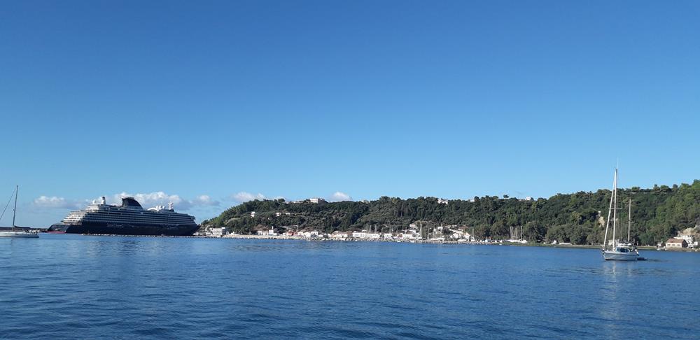 Eine ruhige Nacht. Nach dem Frühstück am nächsten Morgen geht es wieder Richtung Norden mit Groß und Genua und vielen Kreuzschlägen. Ab Mittag lässt der Wind leider wieder nach und ich komme nur noch unter Motor weiter voran. Erst nördlich von Zakynthos Stadt nimmt der Wind wieder zu, sogar bis zu 17 Kn, aber genau von vorn. In der Enge zwischen Kefalonia und Zakynthos baut sich schnell eine kurze Welle von über 1m auf. Eine sehr unruhige Fahrt nur unter Motor und Groß. Kurz vor meinem Ziel Skala im Windschatten von Kefalonia beruhigt sich die See und ich kann in Ruhe meinen Ankerplatz aussuchen. Die Nacht wird leider sehr unruhig, da der Schwell irgendwann plötzlich aus SO kam. Einen weiteren Tag bleibe ich noch hier, am Land gibt es einen Supermarkt, wo ich meine Vorräte noch einmal für die Überfahrt nach Sizilien auffüllen kann.