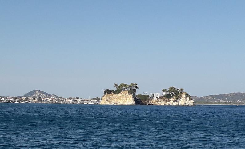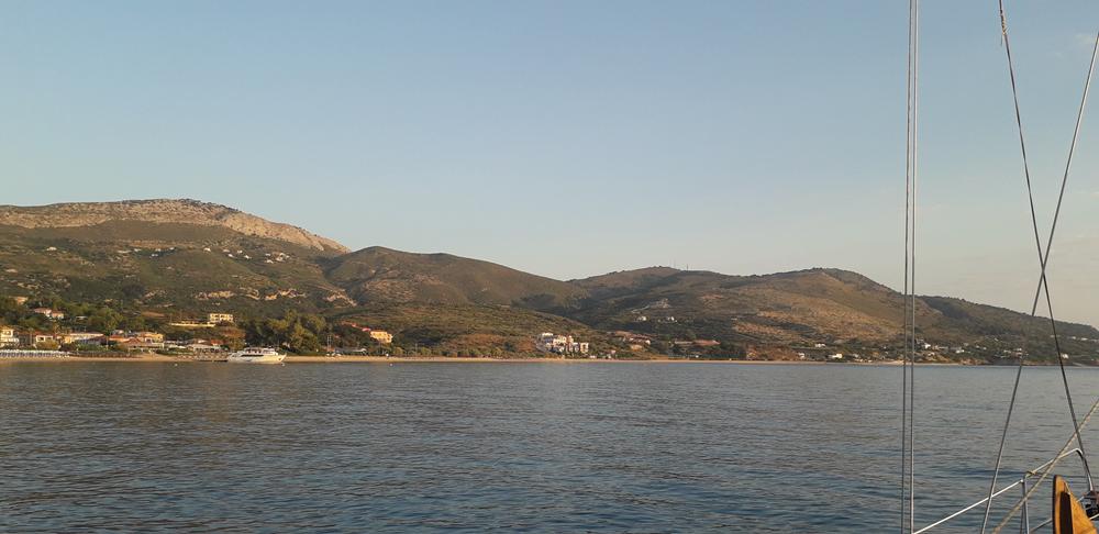 Am 05.09. ist de Windvorhersage gut um an Zakynthos vorbei nach Kefalonia zu kommen. Gegen neun Anker auf und unter Motor raus um die Landzunge. Da beginnt auch der Segelwind. Zunächst sieht alles gut aus und ich komme gut voran. Doch der Wind dreht immer mehr auf NW und ich komme nur noch auf die Südspitze von Zakynthos zu, Wende, wieder Richtung Festland. Noch eine Wende, zurück, aber wieder komme ich an der Südspitze nicht vorbei. Ein Kreuzen Richtung NW würde zu lange dauern, um noch bis Sonnenuntergang einen Ankerplatz im Norden zu finden. So ändere ich etwas den Kurs und segele in die Große Bucht auf der Südseite Richtung Kiri. Der Wind ist stärker als vermutet und ein starker Schwell entsteht kurz unterhalb der Küste. Im östlichen Bereich werfe ich den Anker auf 5m Tiefe. Der Schwell ist dort nicht mehr so groß.