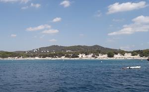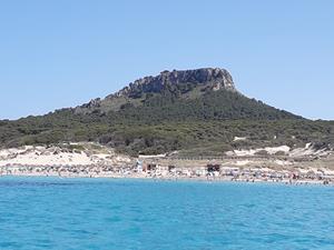 Am fünften Tag geht es für mich weiter. Unter Segel und mit Kreuzschlägen komme ich bis zum Kap Farrutx. Da schläft der Wind ein und nur mit Motor erreiche ich die Cala Mesquida in der nur noch ein Boot ankert. Hier gibt es die größte Düne Mallorcas. Auch hier glasklares Wasser, aber ein wenig Schwell kommt von den Felswänden zurück.