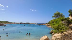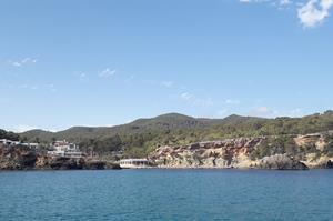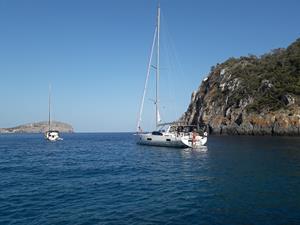 In der Nacht dreht der Wind und starker Schwell steht in die Bucht. Kaum an Schlaf zu denken. Doch am nächsten Morgen beruhigt sich wieder alles und wir bleiben hier noch liegen. Die Wettervorhersage lässt eine angenehme Weiterfahrt nicht zu. Das kristallklare Wasser lädt immer wieder zum Baden ein. Abends gehen wir wieder an Land essen. Der nächste Tag verspricht gutes Segelwetter, wir wollen Richtung Sant Antoni. Als wir um die kleinen vorgelagerten Inseln herum sind, nehmen Wind und Wellen stark zu. Der direkte Kurs ist nicht zu segeln, also auf die Nordseite des Fjords und dann durch die Wellenberge gewendet.