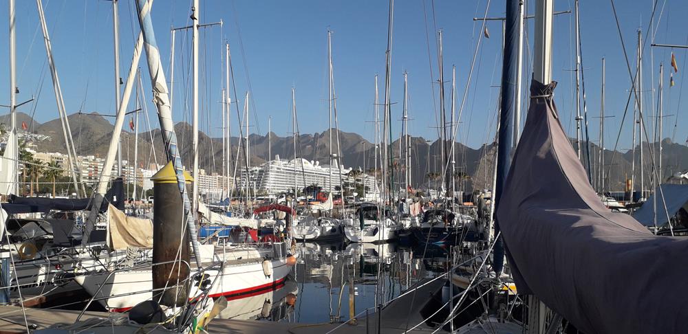 Da ich nicht mitten in der Nacht in Teneriffa ankommen will, fahre ich erst nachmittags los. Vorher noch in Las Palmas den Tank gefüllt. Bis zur Nordspitze motort, aber auch danach setzt der vorhergesagte Wind nicht ein. Noch weitere Meilen unter Motor bis ich in die Straße zwischen Gran Canaria und Teneriffa komme. Nun geht es gemütlich unter Segel mit 2-3 kn voran. Ich muss ein Verkehrstrennungsgebiet an einer bestimmten Stelle queren. Das wieder unter Motor. Danach frischt der Wind aber kräftig auf und auf einmal segele ich mit 5-6 kn und bin doch zu früh vor Santa Cruz, wo ich einen Liegeplatz gebucht hatte. Ich lasse mich vor dem Hafen bis Sonnenaufgang treiben und fahre dann in die Marina. Die Marineros nehmen mich freundlich in Empfang. Nachdem das Büro geöffnet hat, melde ich mich an, erhalte den Chip für den Zugang zum Liegeplatz und den Waschräumen. Räume das Cockpit auf und tuche das Segel richtig auf den Baum.