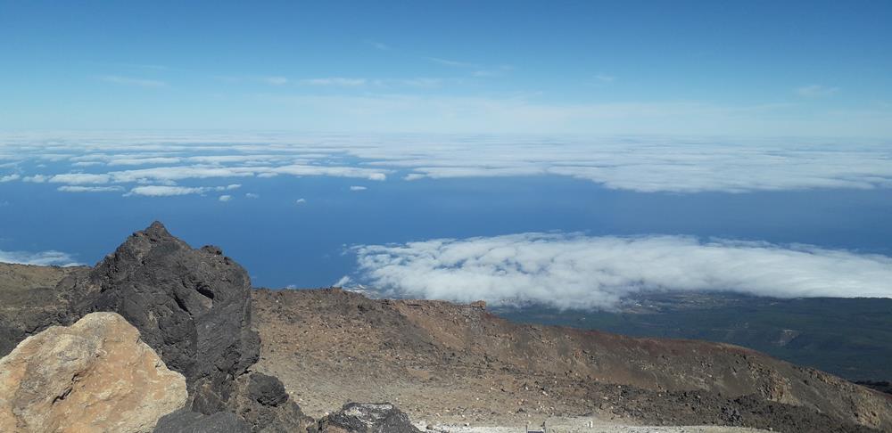 Ohne lange Wartezeiten können wir in die Gondel und werden auf 3500 hochgefahren. Die Luft ist hier echt dünner. Ich merke, wie schwierig es mir fällt, den kurzen Weg zu einem Aussichtspunt über einige Treppen zu gehen. Leider hat man nur eine Stunde Aufenthalt, länger darf keiner hier oben bleiben. Aber der Ausblick ist traumhaft. Auch die Spitzen der Inseln Gran Canaria, Gomera und La Palma schauen aus den Wolken hervor.