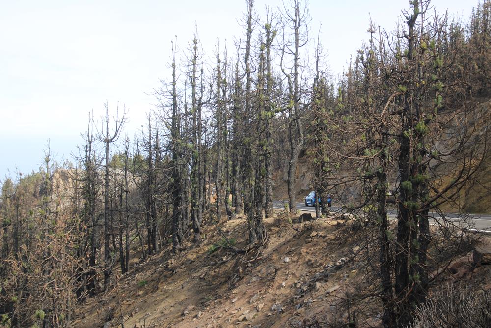 In Buenavista kurzer Halt und dann über eine sehr schmale Bergstraße nach Masca. Ab hier gibt es dann auch noch Staus vor einigen Haarnadelkurven. Nach 1 Stunde und nur 20KM geht es dann endlich flüssiger weiter bis Santiago del Teide. Ab hier gibt es wieder eine gut ausgebaute Straße zurück nach Puerto de la Cruz und weiter nach Santa Cruz. Die schönste Tour durch den Teide Nationalpark starte ich am nächsten Tag. Schnell bin ich auf der in der Mitte der Insel verlaufenen Straße -und auf 1000m Höhe-, die durch wunderschöne Pinienwälder führt. Tolle Aussichtspunkte und immer den Pico del Teide im Blick. Heute habe ich Glück und finde überall einen Parkplatz. Einem Teil der Wälder sieht man noch die Folgen der großen Brandkatastrophe von 2023 an. Schwarze Baumstämme, verbrannte Flächen.