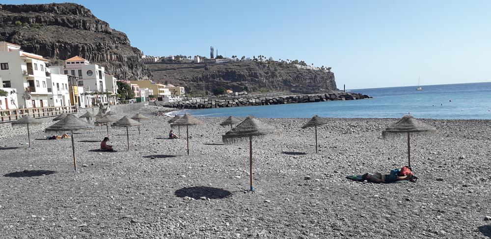 Nächstes Mal unbedingt mehr zu trinken mitnehmen. Gegen sechs erreichen wir den kleinen Ort Jerdune, wo wir den Bus zurück nach San Sebastian nehmen können. In der Bar gleichen wir den Flüssigkeitsverlust aus und essen eine Kleinigkeit. Mit dem Bus fahre ich am nächsten Tag nach Valle Gran Rey, am gegenüberliegenden Ende im Westen der kleinen Insel. Die Tour führt durch eine fantastische abwechslungsreiche Landschaft. Valle Gran Rey gilt immer noch als Hippie Stadt, aber so richtig merke ich tagsüber davon nichts.