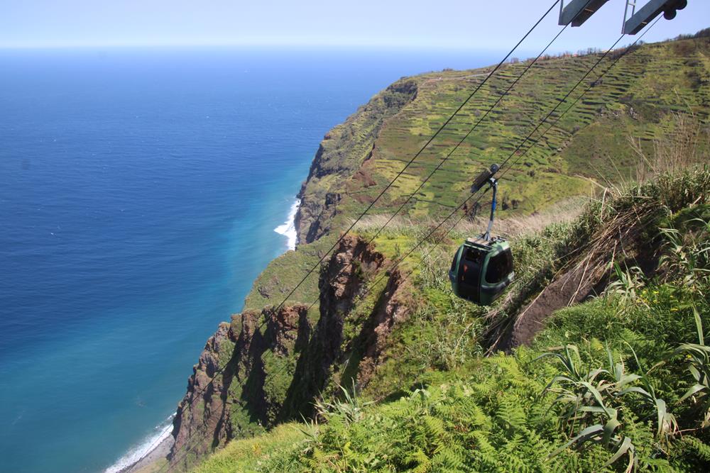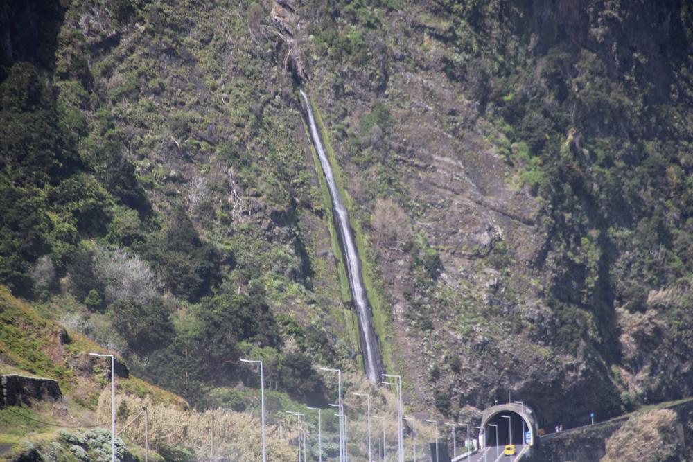 Am Stadtende gibt es einen beeindruckenden Wasserfall kurz vor dem Tunnel auf der Straße, die mich nach Porto Moniz führt. Hier ist es so voll, dass ich keinen Parkplatz finde und weiterfahren muss. Es geht in Serpentinen hoch nach Achadas, wo ich eigentlich einmal mit der spektakulären Seilbahn (90 Grad Gefälle) runter zum Strand fahren wollte.