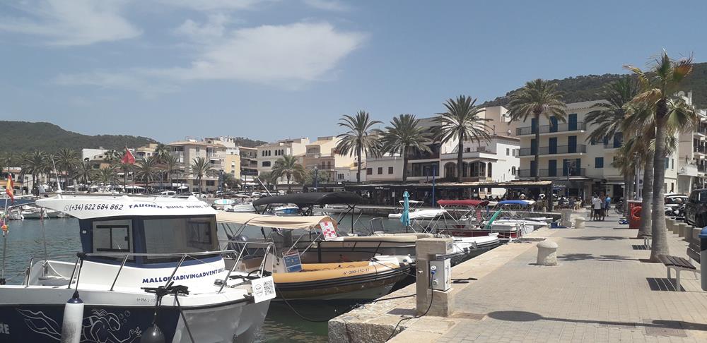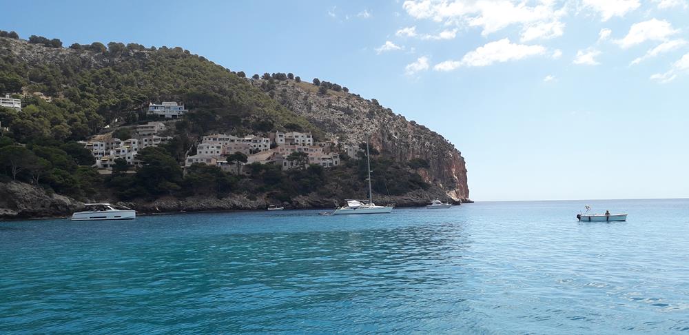 Im Morgengrauen konnte ich Mallorca erkennen. In Santa Ponsa wollte ich vor Anker gehen. Leider drehte der Wind in die falsche Richtung und die letzten Meilen lief ich unter Motor nach Santa Ponsa. Die Bucht war sehr stark besucht und ich hatte Schwierigkeiten einen Ankerplatz zu finden. Und wenn, hielt der Anker nicht. So fuhr ich wieder raus und konnte in der nächsten Bucht vor Peguera prima alleine vor Anker in klarem Wasser liegen. In Andratx hatte ich für den nächsten Tag einen Liegeplatz gebucht. Die paar Meilen dorthin legte ich unter Motor zurück. Super Service am Steg. Schnelle Anmeldung.