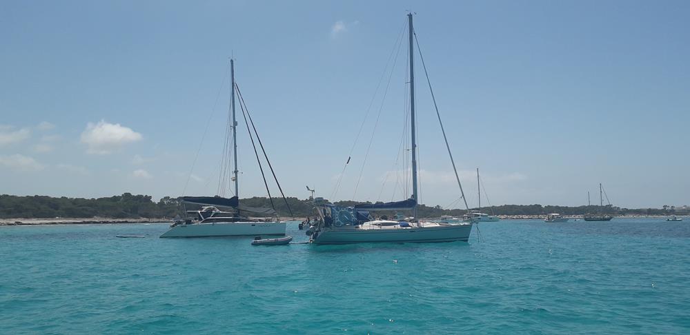 Mit dem Bus noch einmal nach Peguera zum Einkaufen bei Lidl. Nach dem Frühstück am nächsten Tag rüber zur Tankstelle motort. Dauerte etwas bis ich anlegen konnte. Motoryachten brauchen unendlich lange um ihre Riesentanks zu füllen. Aus der Bucht raus, Segel gesetzt und gemütlich bis zum Cap Blanc. Ab hier ließ der Wind nach und ich musste bis zum Ankerplatz Es Trenc doch wieder motoren. Dicht bei meinen Freunden von der MUSKAT ließ ich den Anker fallen. Schön sie nach so langer Zeit wiederzusehen. Auch Jan traf ich hier wieder.