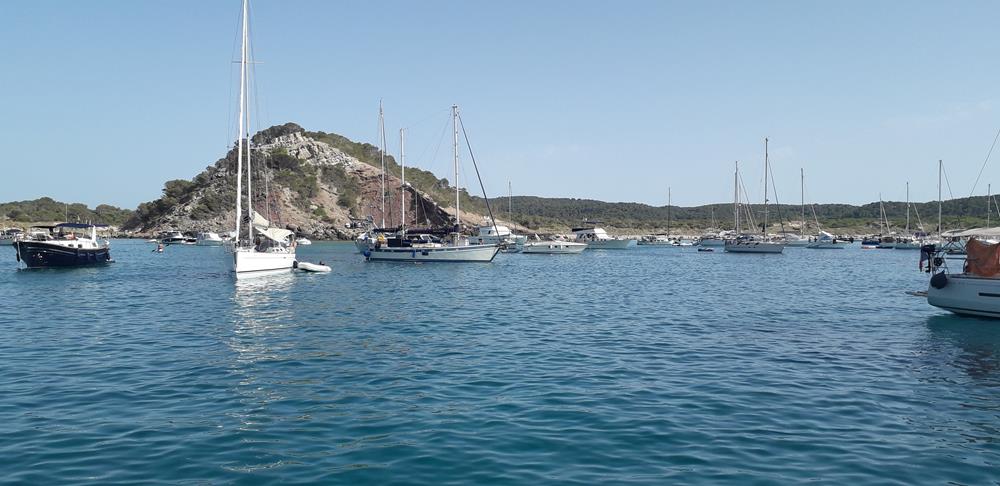 Abends wird es glücklicherweise etwas ruhiger und ich kann noch etwas Schwimmen und den Wassermacher laufen lassen. Am nächsten Tag kommen Robin und Iris mit ihrer Yacht aus Fornells hierher. Wir verbringen einen wunderschönen Tag zusammen, abends bin ich bei ihnen zum Essen eingeladen. Gegen neun Uhr morgens verlassen wir beide die Bucht und machen uns nach Fornells auf. Zunächst ist der Wind noch recht schwach, aber ich segele trotzdem, muss allerdings erst nördlich um dann zu wenden und wieder Kurs auf die Küste zu nehmen. Der Wind hat gut aufgefrischt und ich komme schnell voran, allerdings nicht genau in die Bucht bei Fornells, also noch einmal wenden, raus und wieder zurück. Diesmal kann ich direkt auf Fornells zuhalten. Robin und Iris sind schon vor Anker, aber kein Platz in ihrer Nähe, aber 100 m weiter finde ich auch einen guten Ankerplatz. Abends gehen wir gemeinsam im Ort essen. Eine Bucht weiter liegt die Muskat zu denen ich heute hin motore. Keine weiteren Boote zurzeit in der Bucht und ich kann dicht bei meinen Freunden ankern. Glasklares Wasser und völlige Ruhe.
