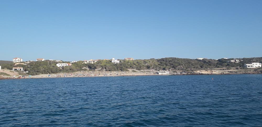 Später kommen noch weitere Boote hierher, da ist es zunächst mit der Ruhe vorbei. Auch hier bin ich abends zum Essen eingeladen. Am nächsten Morgen haben wir die Bucht wieder fast für uns allein, aber ab Mittag fallen doch viele wieder ein. Jetzt ist es schon August. Hochsaison. Ich mache mich auf den Weg nach Es Grau. Hier finde ich schnell einen Platz. Kleine Motorboote flitzen hin und her. Ich besuche die kleine Stadt und kaufe ein. Bleibe nur einen Tag hier und fahre dann weiter und wollte in Mahon tanken. Aber es war so viel Verkehr, dass ich weiter an die Südostspitze gesegelt bin und dann wieder westwärts bis ich einen Ankerplatz vor der Playa Binigaus finde. Hier treffe ich die Muskat wieder, die ihre Pläne für Menorca verworfen haben, wegen der Überfüllung überall.